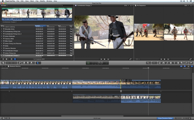 Obviously, Apple is taking bold steps to re-define the NLE. Some will probably work, some won’t. The magnetic timeline is pretty useful. The event/clip preview window makes perfect sense to me now. The way background processing is handled seems like a big time-saver. The no-save thing is cool; but I really miss not being able to have multiple timelines in a project. And the video/audio sync and multi-cam are huge steps forward for the DSLR crowd.
